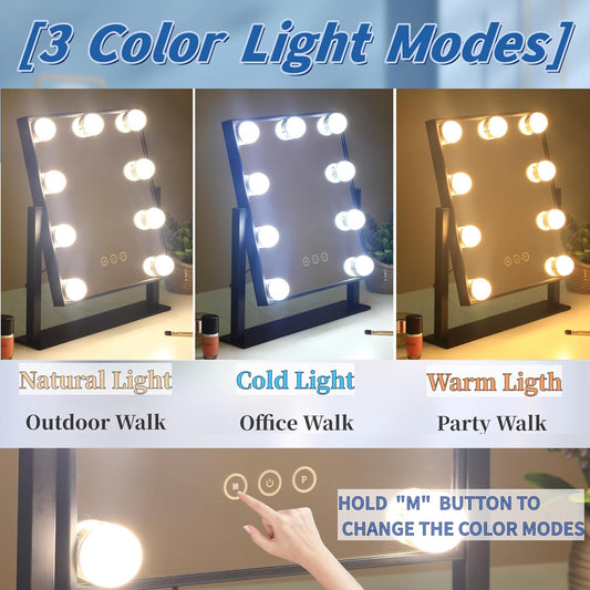 Goolioo Vanity Mirror with Lights, Hollywood Lighted Vanity Makeup Mirror, Detachable 10x Magnification 360°Ratation, Black